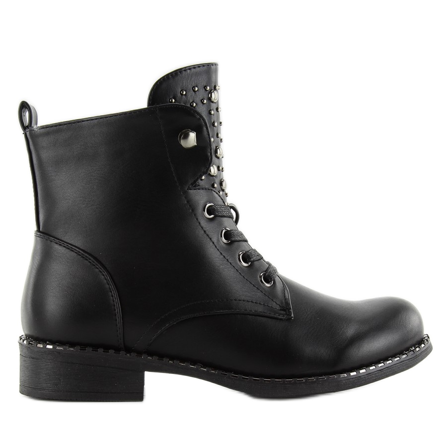 Stylish studded worker boots hq893 Black are a great choice for women who value a fashionable and bold look. These black women's military-style boots combine comfort and unique design. Made of high-quality ecological leather, they are characterized by a solid sole, which has been enriched with an unusual piping with inscriptions and silver plates, giving them an original character.