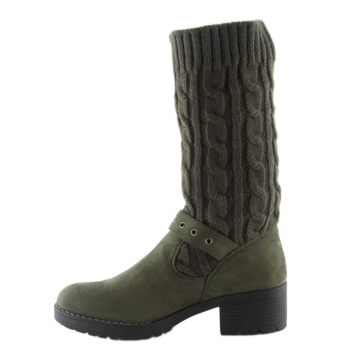 Knitted upper boots NC109 in green are the perfect choice for women who want to combine comfort with fashionable design. These unique shoes reach above the knee, and their upper is made of soft yarn, which makes them not only stylish but also comfortable to wear. Thanks to the possibility of pulling the upper all the way up or delicate gathers, you can freely change their appearance and match them to different styles.