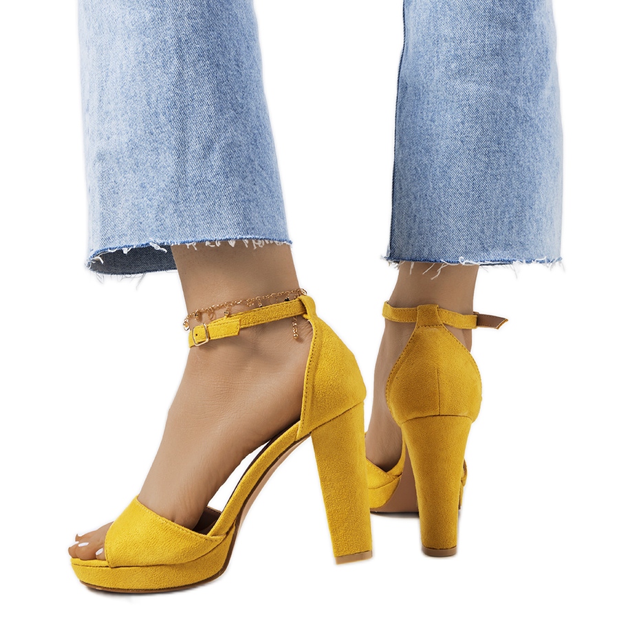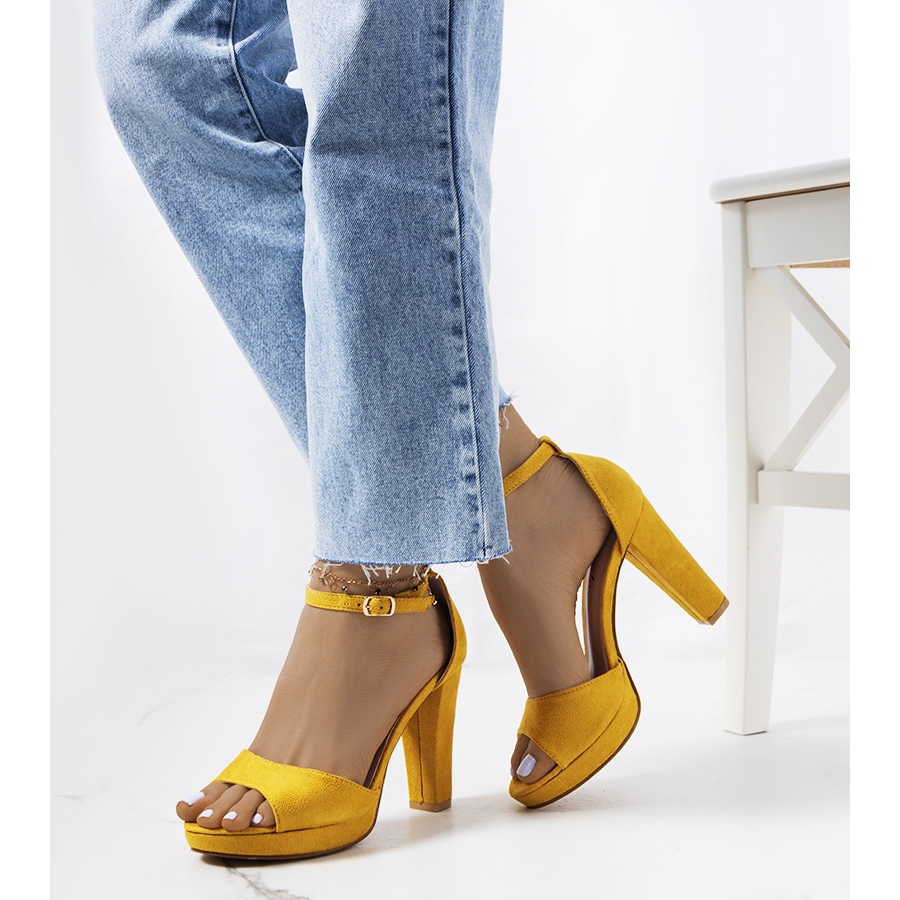 We present beautiful yellow Saldana block heel sandals that will become an essential element of your summer wardrobe. Their classic design will perfectly emphasize the feminine silhouette, and the high heel will add elegance and self-confidence to any styling.
