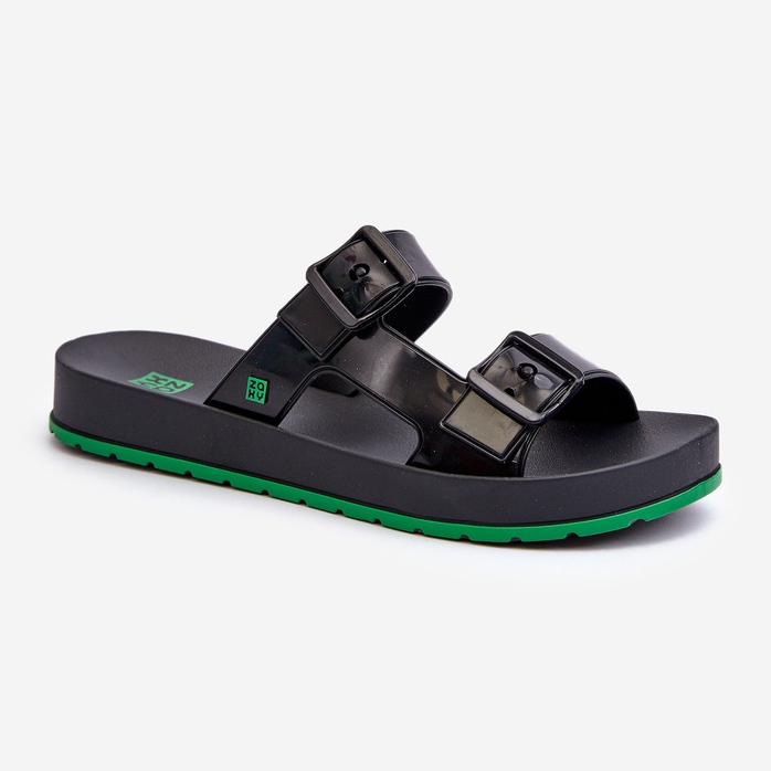 These flip flops are characterized by a sliding clasp, a lack of a nose and a flat sole with a height of 3 cm, which ensures maximum comfort when walking. Additional details, like the green color of the soles, give them a modern look.