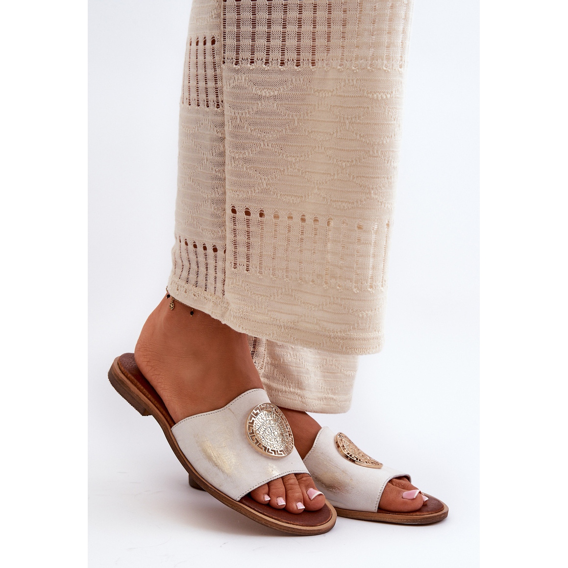 Details: Zazoo 2938 Leather Flip-Flops On a Flat Heel With a Gold Decoration, Brushed golden