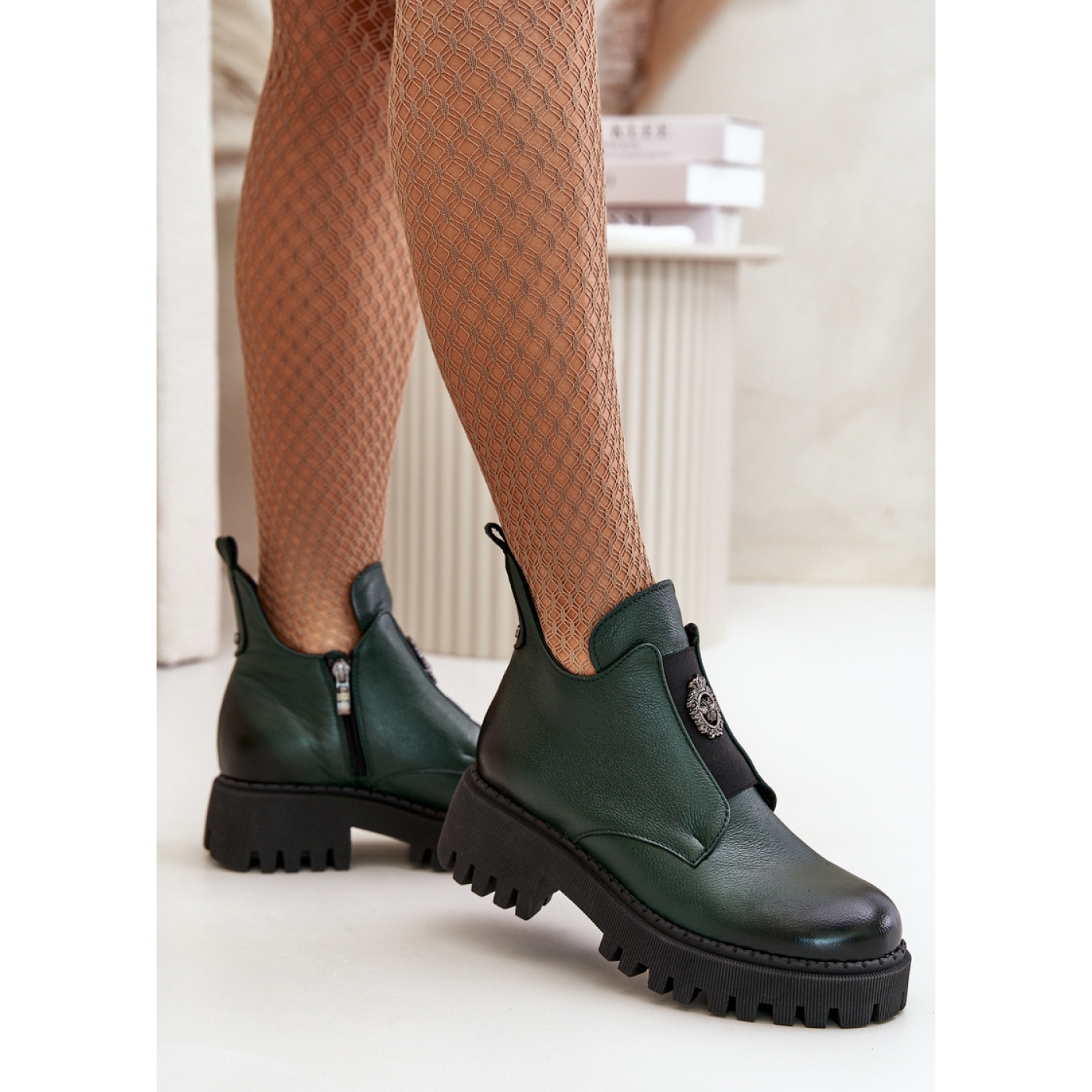 We present women's zazoo boots in a beautiful, dark green shade that will perfectly complement your wardrobe. Made of high quality natural leather, they combine comfort and elegance. Their unique design based on a massive heel with a height of 6 cm and a platform with grooves (3.5 cm) ensures stability and comfort when wearing.