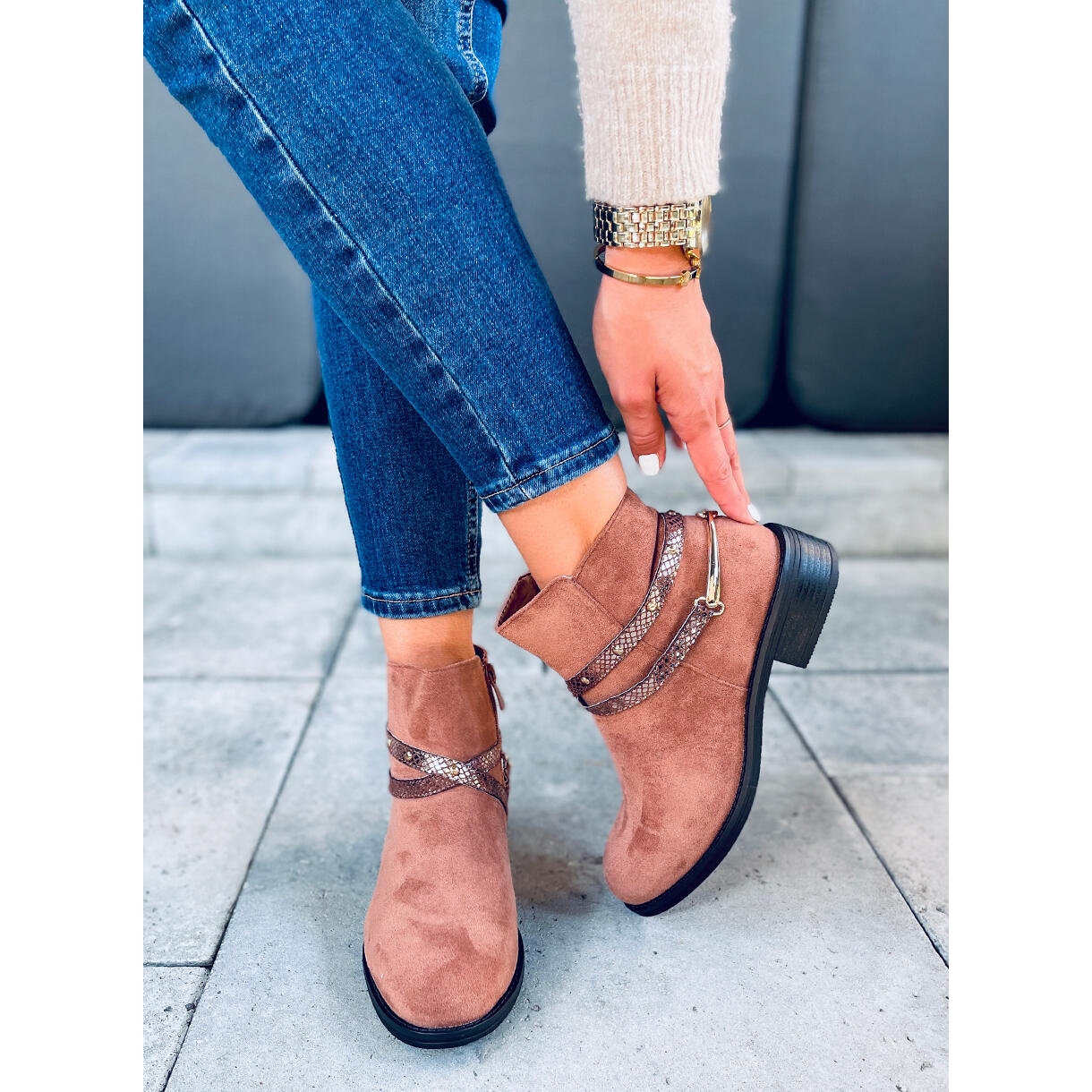 We present the Zinaida Camel suede ankle boots for women, which impress with their fashionable design and exceptional comfort. These brown ankle boots with a flat heel are the perfect choice for everyday wear, combining elegance with practicality. The upper, which subtly wraps around the ankle, is decorated with snakeskin-patterned straps, which gives them a unique character.